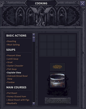 Cooking is a process that uses different types of raw Food: raw meat, fish, mushrooms and potatoes, and turns them into cooked versions, improving the bonuses you gain from eating them. In the Rags to Riches update, cooking system developed into a broader mechanic and introduced dishes that use many ingredients to create and recipes to make.