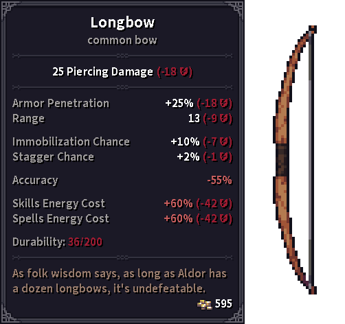 Items purchased in town are usually sold at 100% durability. Looted items are often partially damaged, with items from living enemies and treasure chests usually at higher durability, and items from undead enemies usually nearly destroyed. Items with low durability cannot be sold in most shops. When an item's durability lowers below a certain point, the item degrades and the bonuses it normally provides are reduced until the item is repaired. Items with low durability also have different sprites, allowing you to spot a degraded item at a glance:
