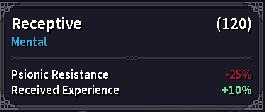 Effects : Receptive 120 turns (Psionic Resistance -25%, Backfire Chance -10%, Recieved Experience +10%)