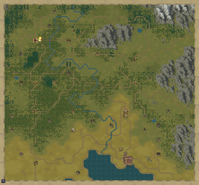 The current size of the map is 38x35 tiles. For now, it includes the Brynn March with one city (Brynn) and three villages (Osbrook, Mannshire and Denbrie) as well as other locations.